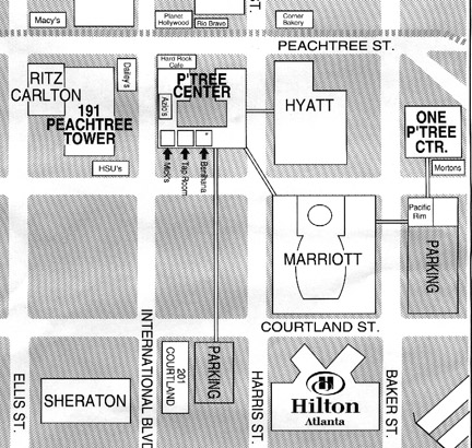 [sign points to Peachtree Street] and go through the glass doors into