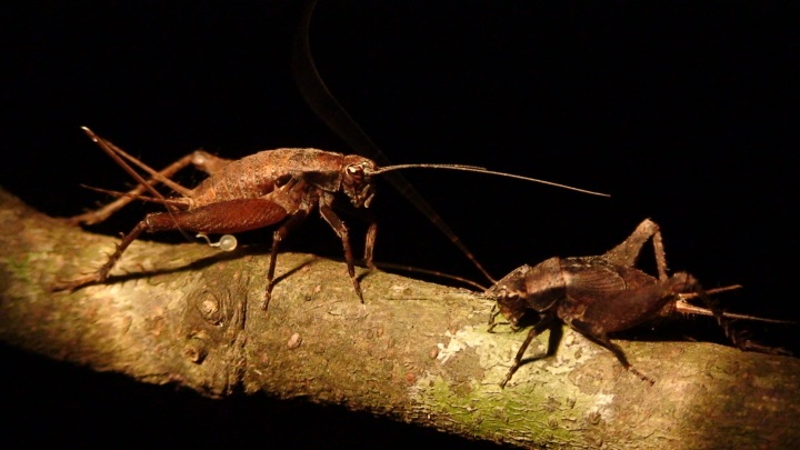 While studying a group of little-known ‘Lebinthine’ field crickets found in the humid understories of Indo-Pacific jungles, Dartmouth College assistant professor Hannah ter Hofstede1 ended up unraveling just such a courtship system. On first inspection, ter Hoftede was puzzled by the behavior these crickets exhibited in the lab; not only did male Lebinthines sing completely off-key, but the females apparently lacked the usual (for crickets) reaction of walking towards the source of male calls. “That’s where I came across the first stumbling block,” recalls ter Hofstede, “the females would never approach male calls”. Stranger still, the male songs of these species – sung at more than twice the frequency of conventional cricket calls – were nearly the same pitch as those of bats, a major cricket predator.