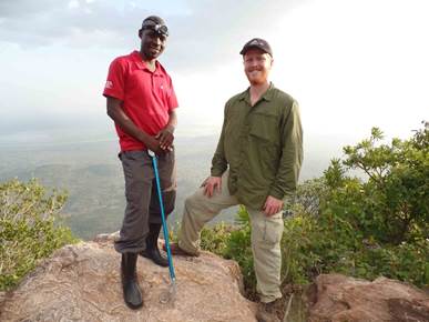 Danny Hughes (right) and Wilber Lukwago, a Senior Environment Officer with the Uganda National Roads Authority (UNRA) (left) wait for nightfall to hunt chameleons. Lukwago was collecting frogs for his master's thesis when he met Hughes. He has since accompanied Hughes in the field for each of Hughes' expeditions to help collect chameleons. Lukwago and his MS adviser, Dr. Mathias Behangana, of the Department of Environmental Management at Makerere University, have been pivotal in providing Hughes with assistance and advice for his ongoing research on chameleons. Photo courtesy of Danny Hughes.