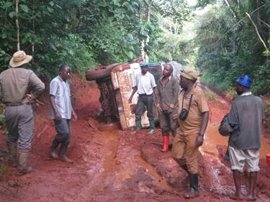Congolese locals appear to help pull out the flipped field truck. Photo courtesy of Danny Hughes.