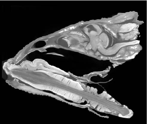 A diceCT section through the head of a Johnston's chameleon shows the simultaneous visualization of soft tissues alongside bony structures of the cranium. Photo courtesy of Danny Hughes.