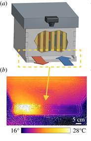 Figure 2. Image from Peters et al. (2019) showing the airflow created by the bees flapping near the entrance to the hive. Caption from the article: “(a) A schematic illustrating the path of air through the hive as induced by fanning bees. Warm, stale air is drawn out of the entrance by fanning bees and relatively cool ambient air enters passively where fanning bees are absent. The camera indicates the viewing angle in (b) and (c). (b) A thermal image of the hive entrance at night when fanning bees are actively fanning. Notice inflowing air at the right of the entrance has cooled the wood and the outflowing air induced by fanning bees on the left has warmed the wood. (c) Honeybees ventilating at the entrance of a hive. Note the dense group of fanning bees at the left of the entrance and the absence of fanning bees at the right of the entrance.”