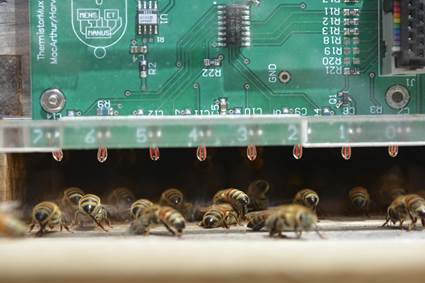 Figure 3. Here you can see honeybees shown at the entrance of a hive with sensors monitoring the heat and air flow near the entrance of the hive.