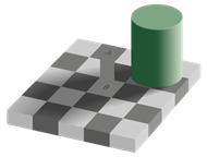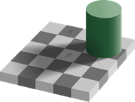 A classic visual illusion that occurs because of color constancy. In (A), the tiles labeled A and B reside next to a tall cylinder, one in its shadow and one outside it. Tile A appears darker to us. (B) If you connect these tiles and remove the gradient of lighting caused by the shadow, we can tell that tiles A and B are actually the same color. The added bar removes the local contrast provided by the shadow’s gradient. (C) Because male tanagers have microstructures that create super black and remove shimmery highlights, colorful plumage next to them appear enhanced because we cannot establish any local contrast around the color. Images under Wikipedia Common License.