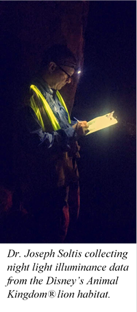 Dr. Joseph Soltis and Ms. Wood’s passion for animal welfare is easily noticeable and reflected in their projects. Dr. Soltis began by studying how animals are affected by noise from factors such as the safari ride, entertainment shows, and construction at Disney’s Animal Kingdom®. His goal is to keep sound at levels that continue to promote great animal welfare. Diving into this project, he realized that it was necessary to study light at the zoo as well, which is when Ms. Wood, Research Associate of the Science Operations Team at Disney’s Animal Kingdom®, joined the project.